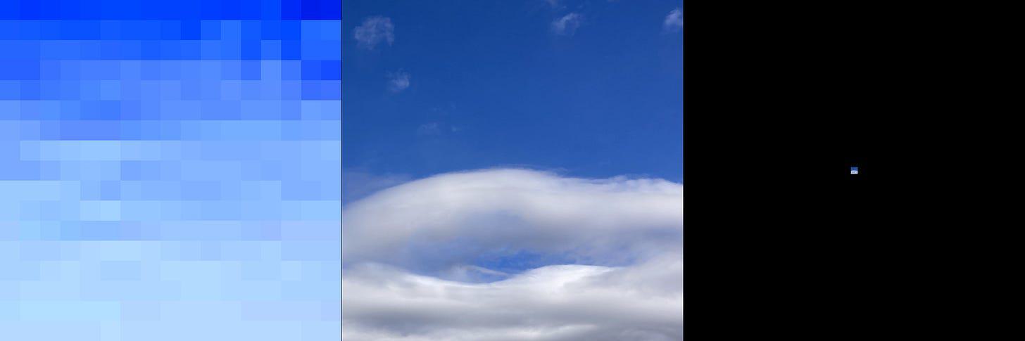 Zooming way in (left), the image is pixelated and unrealistic. Zooming way out (right) all we see is a small square: again, unrealistic. So in practice we have to focus on intermediate scales between the size of the pixels and the size of the image (center). This problem becomes surprisingly thorny, and we had to write two whole papers to cover all the subtleties we encountered.1