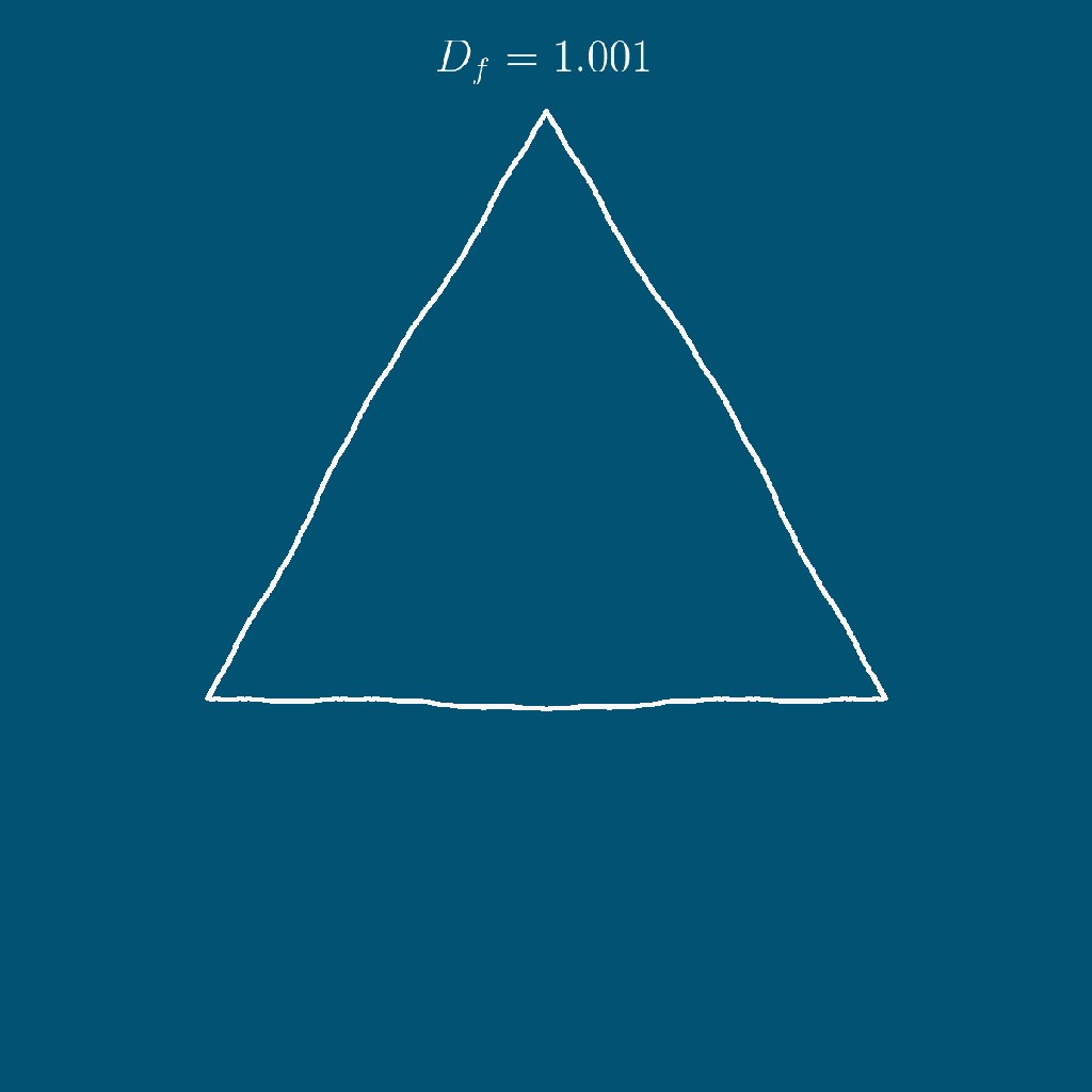 At lower values, the sides become smoother and smoother, eventually becoming a one-dimensional line. At higher dimensions, the shape becomes a tightly packed mess of lines, eventually becoming so tightly packed that the object fills the entire (two-dimensional) triangular regions.