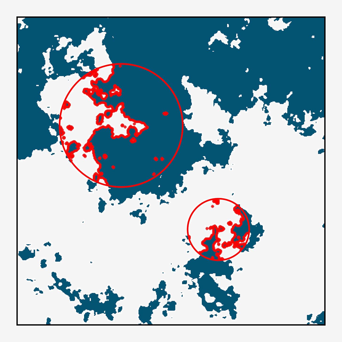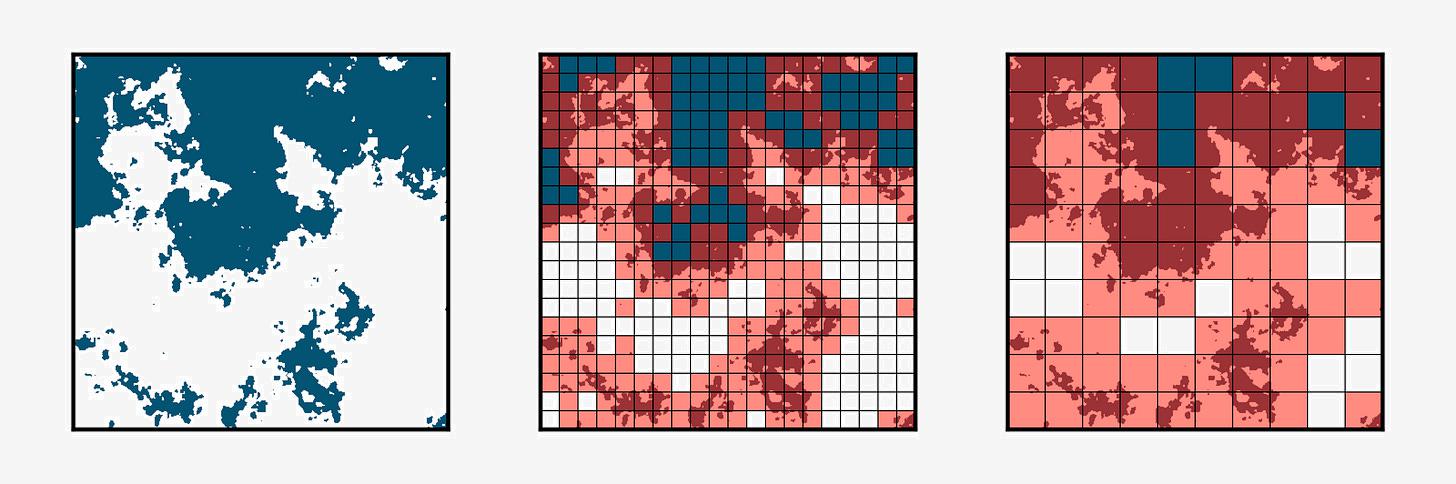 This becomes particularly challenging if you want to perform a fractal analysis using real data like, for example, a satellite image or the simulation output above. Any image is pixelated at small scales and only covers some limited area overall. These are both features of the image—not the clouds themselves—which is not what we care about. Take this image, for example: