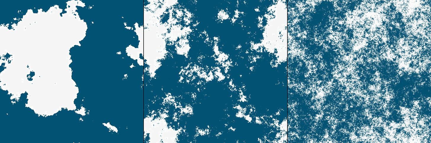 These are from three different atmospheric simulations which produce clouds with fractal dimensions ranging from 1.3 (left), to 1.7 (center), to 2 (right). As you can see, the amount of structure also increases left to right.